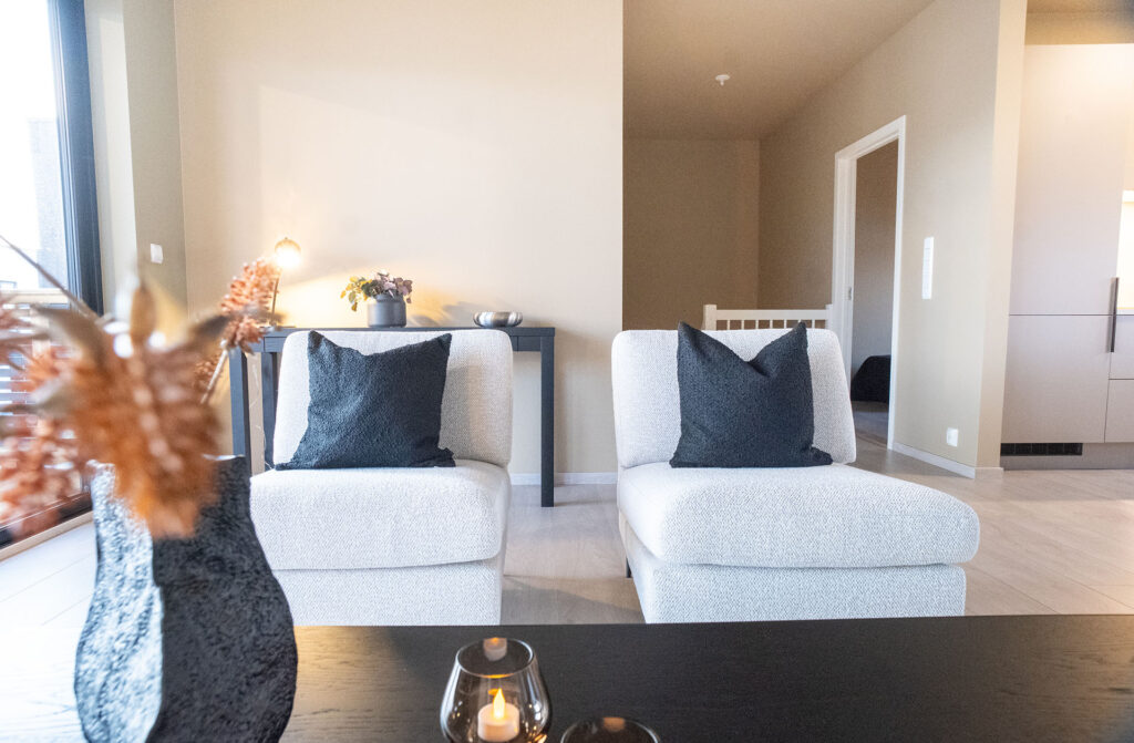 Alle vegger og tak blir sparklet og malt i den fargen du selv ønsker. Boligene har moderne, listefri overganger mellom vegg og tak, samt vindussmyg.