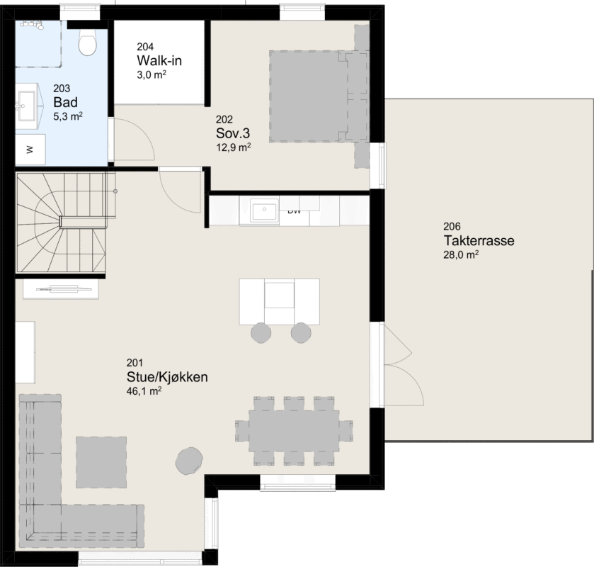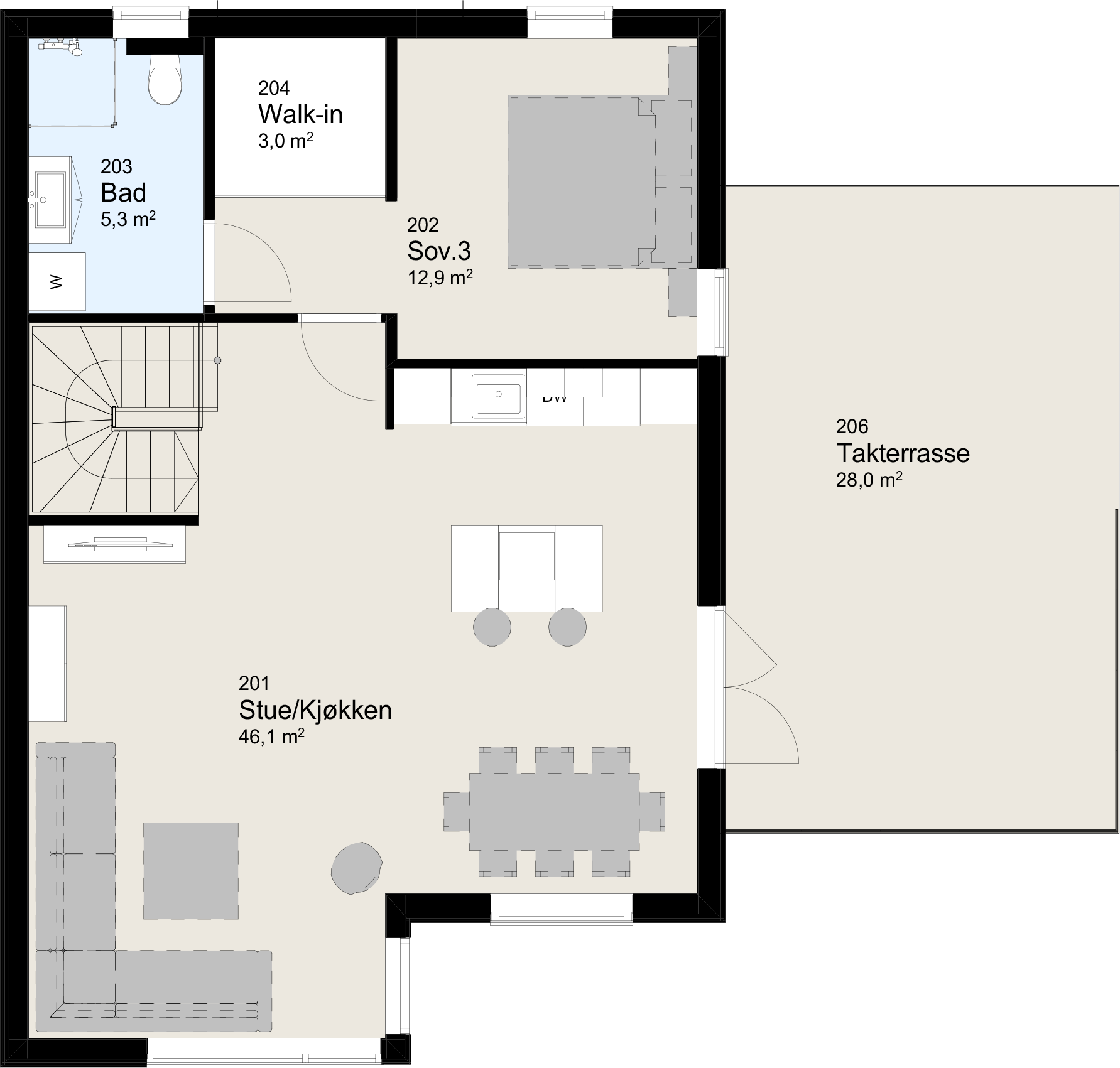 Andre etasje inneholder bad, soverom, walk-in garderobe og stor stue/ kjøkkenløsning.