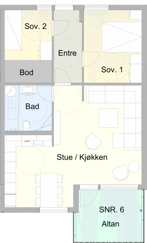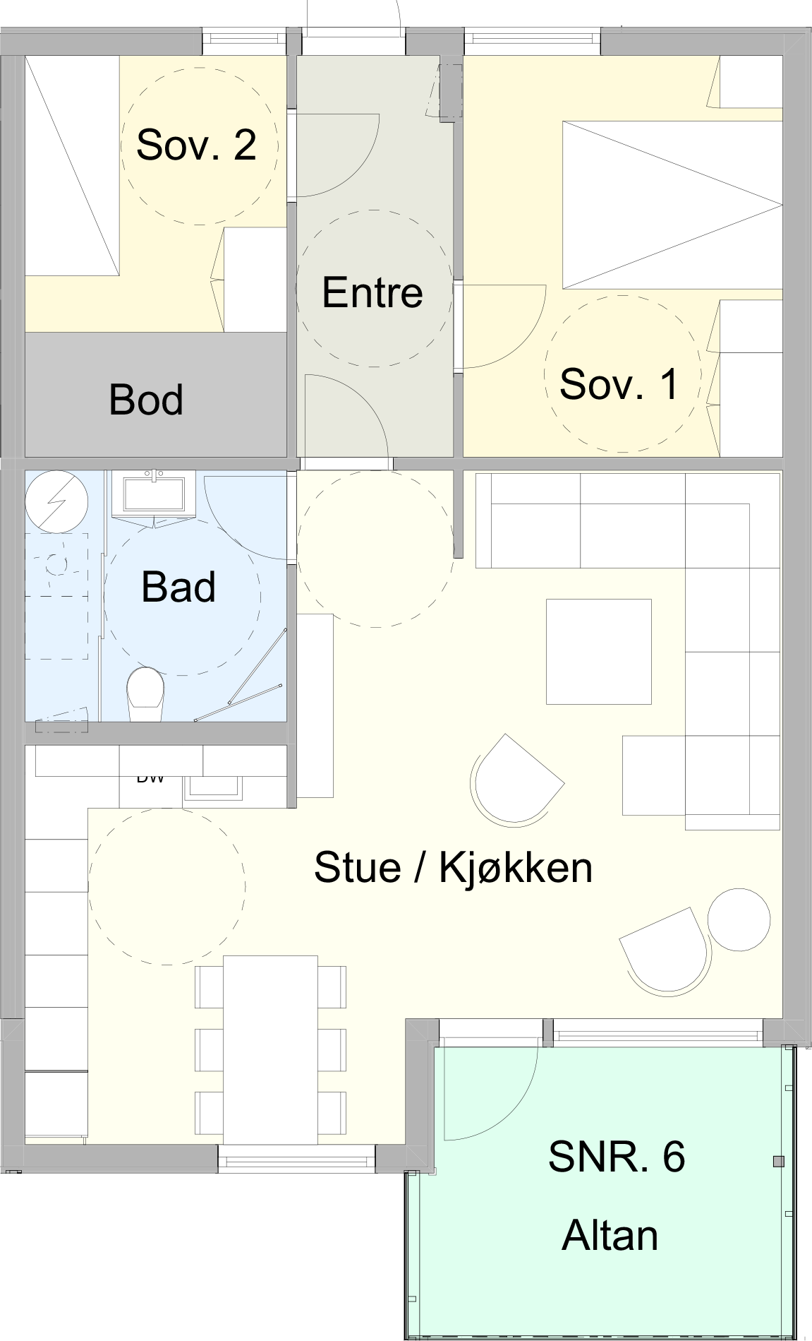 Selv om stue og kjøkken er i samme rom er alikevel kjøkken skjermet fra stuedelen. Leiligheten inneholder også 2 gode soverom med god plass til garderobeløsninger og bodplass.
