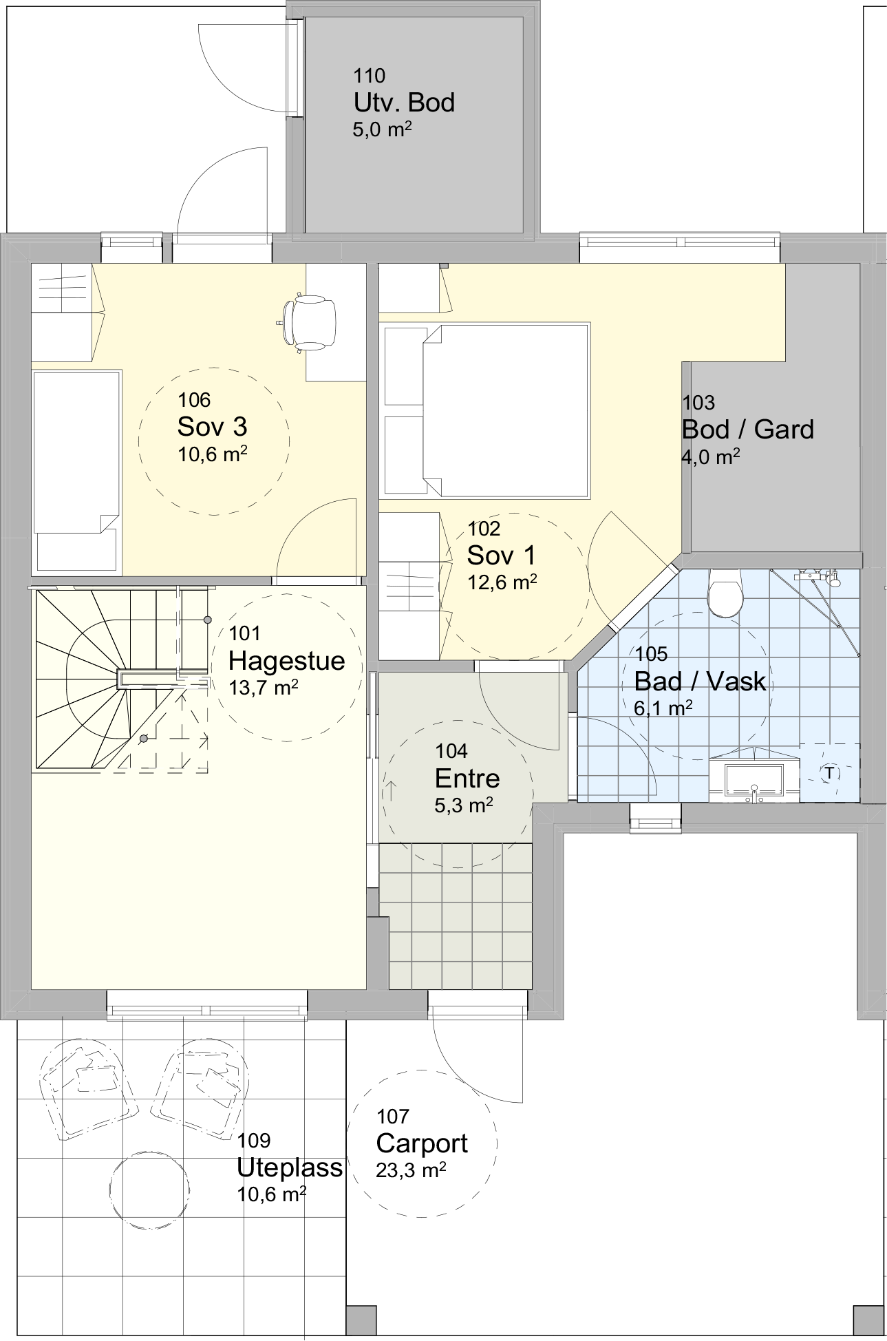 På inngangsplan finnes stor stue ed trivelige uteplasser. Her er det også mulighet for å dele av stuen til fordel for et ekstra soverom dersom det behovet tilsier det.
