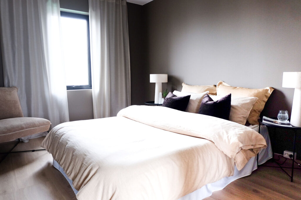 Foreldresoverom med stor walk-in garderobe og romslig bad med direkte inngang både fra soverommet og entré.