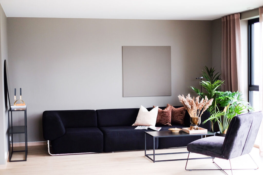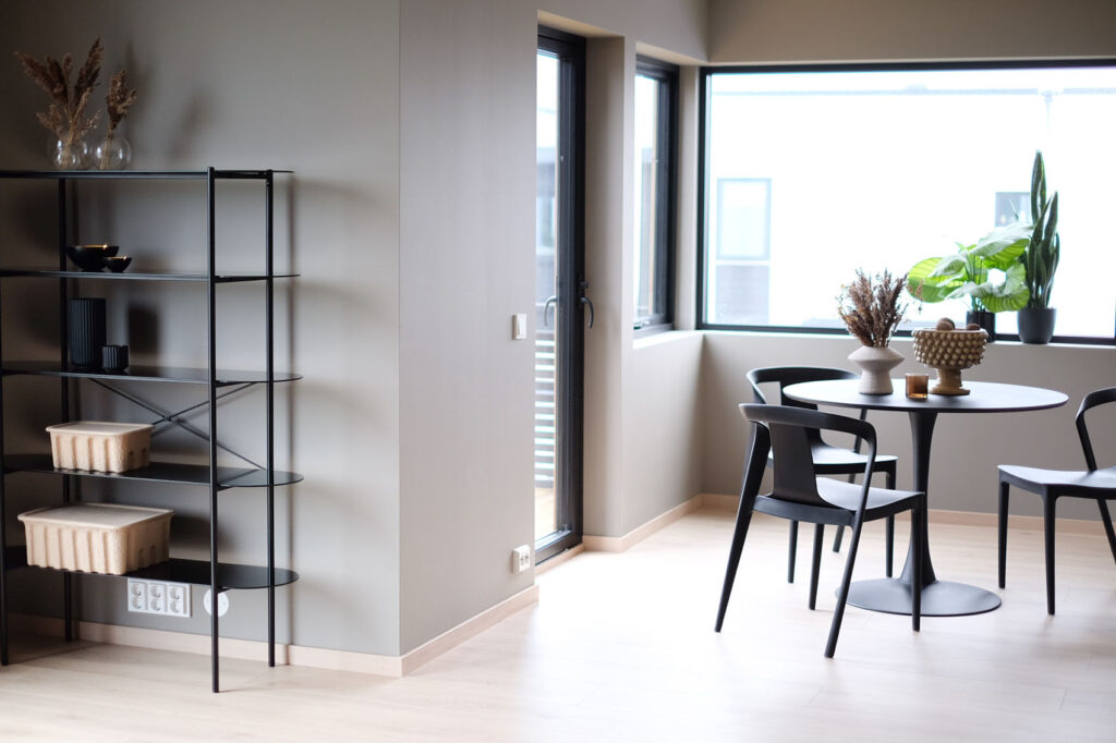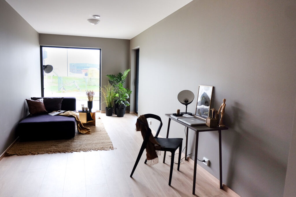 Alle vegger og tak blir sparklet og malt i den fargen du selv ønsker. Boligene har moderne, listefri overganger mellom vegg og tak, samt vindussmyg.