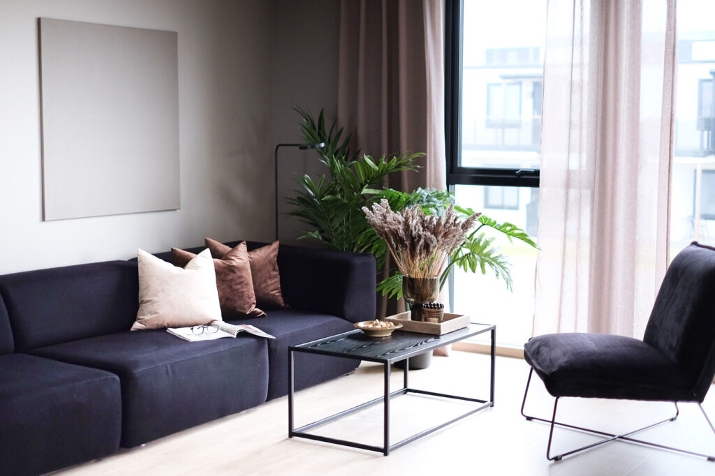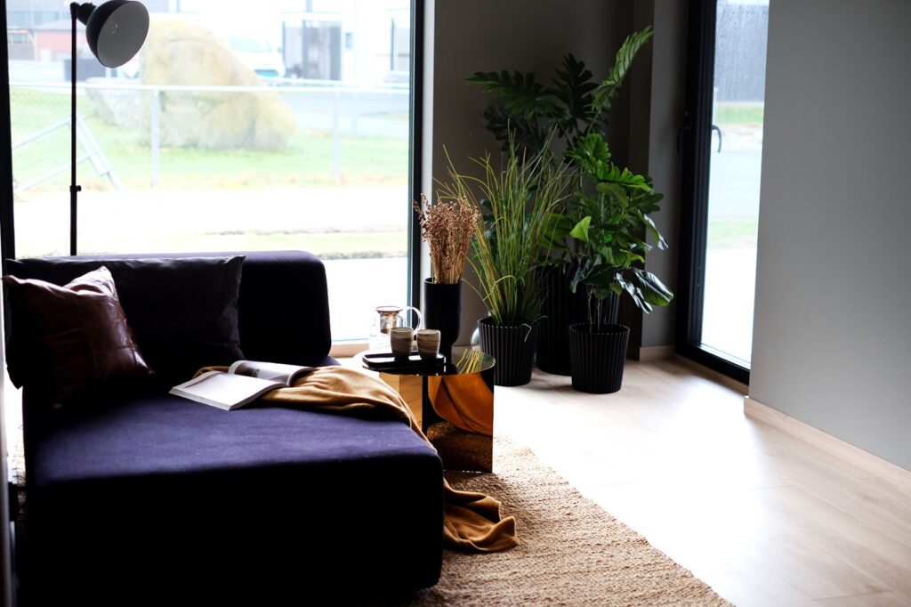 Store vindusflater sørger for mye naturlig lys inn i stuen.