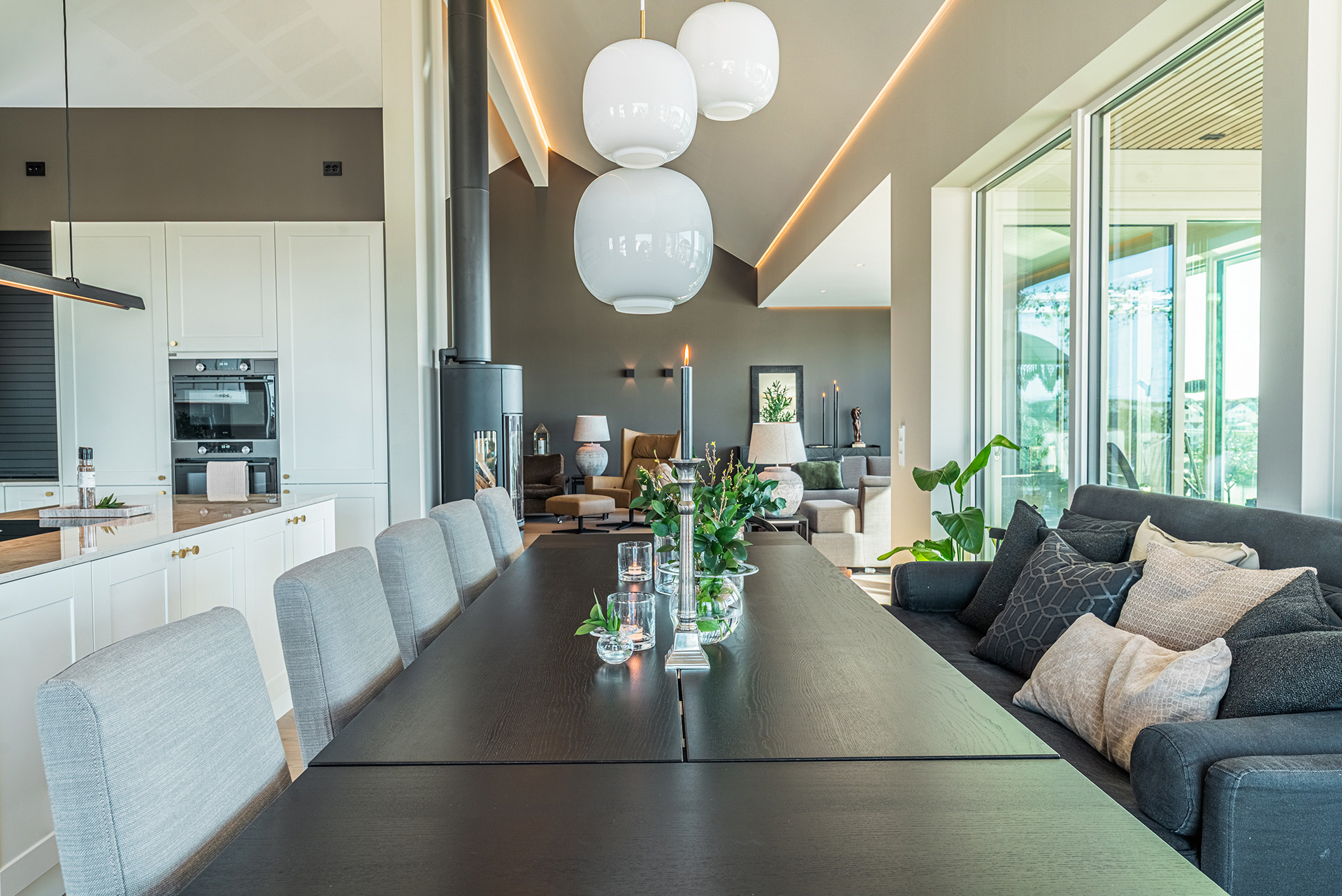 De store vinduene gir mye naturlig lys inn i stuen og sørger for et naturlig gjennomlys i hele stuen.